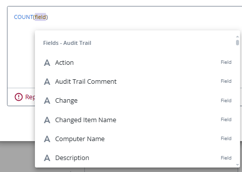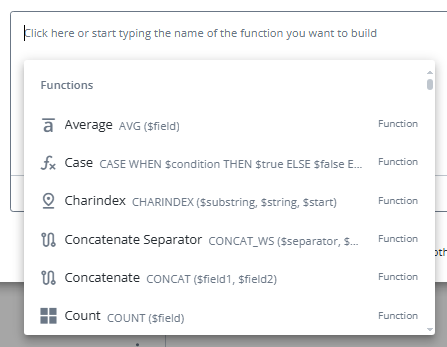 Users can scroll through the list to find other fields that can inserted into the calculation. Alternatively, the selected function might prompt users to select one or more fields.
