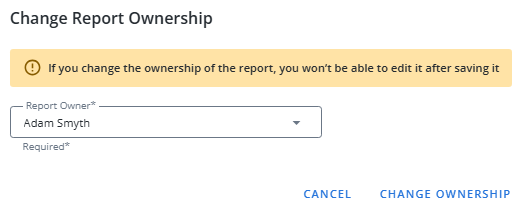 "NextGen" Upland Analytics allows users to transfer ownership of reports to other users. Select Change Ownership and use the window that appears to select a new report owner.