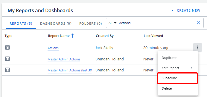 - Duplicate a report/dashboard (available to Report Editors only).
