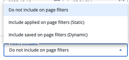 - Include saved on page filters (Dynamic): The subscription will always use the most up-to-date version of your saved on page filters. If you change your saved on page filters later, the subscription will reflect those changes the next time it runs.