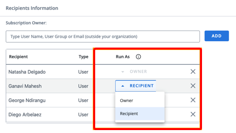 The recipient list now contains a "Run As" column with two options: Owner and Recipient.
