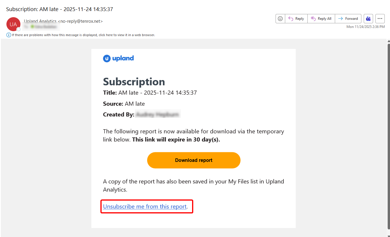 Users now have the option to unsubscribe to reports and Dashboards directly from the subscription emails. Each email now contains an "Unsubscribe" link.