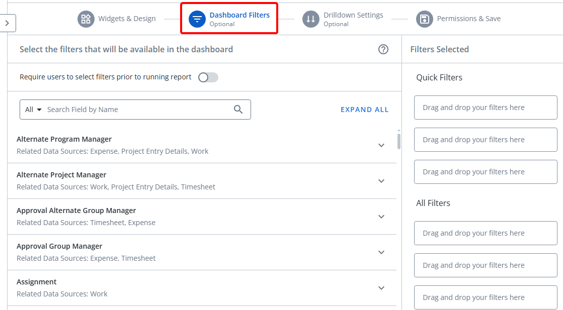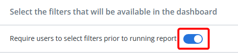 Tip: Toggling "Require users to apply filters before running report" will ensure that users apply at least one filter to the Dashboard before running it.