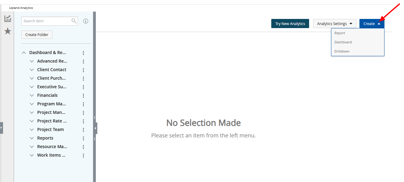 Prior to this release, the Create Folder button was located within the Analytics menu. In the updated interface, folder creation has been streamlined and relocated for improved usability.