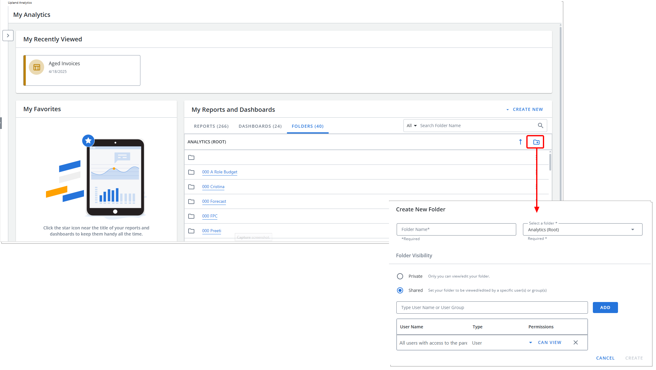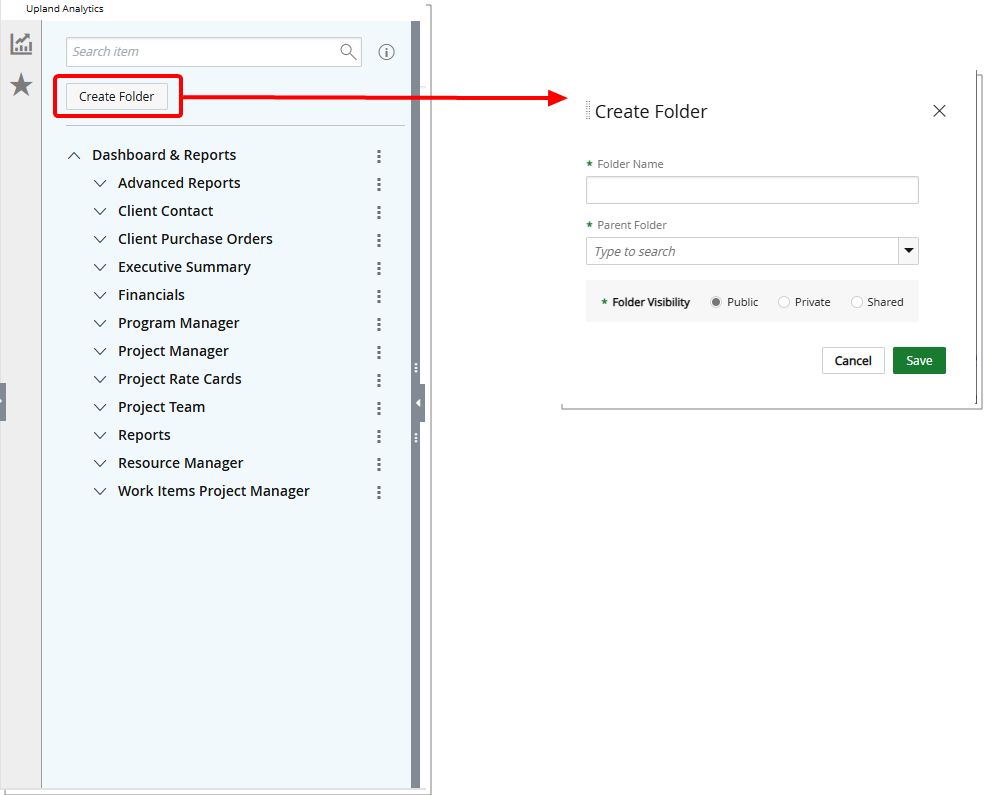 Report Editors in Upland Analytics can create new folders.