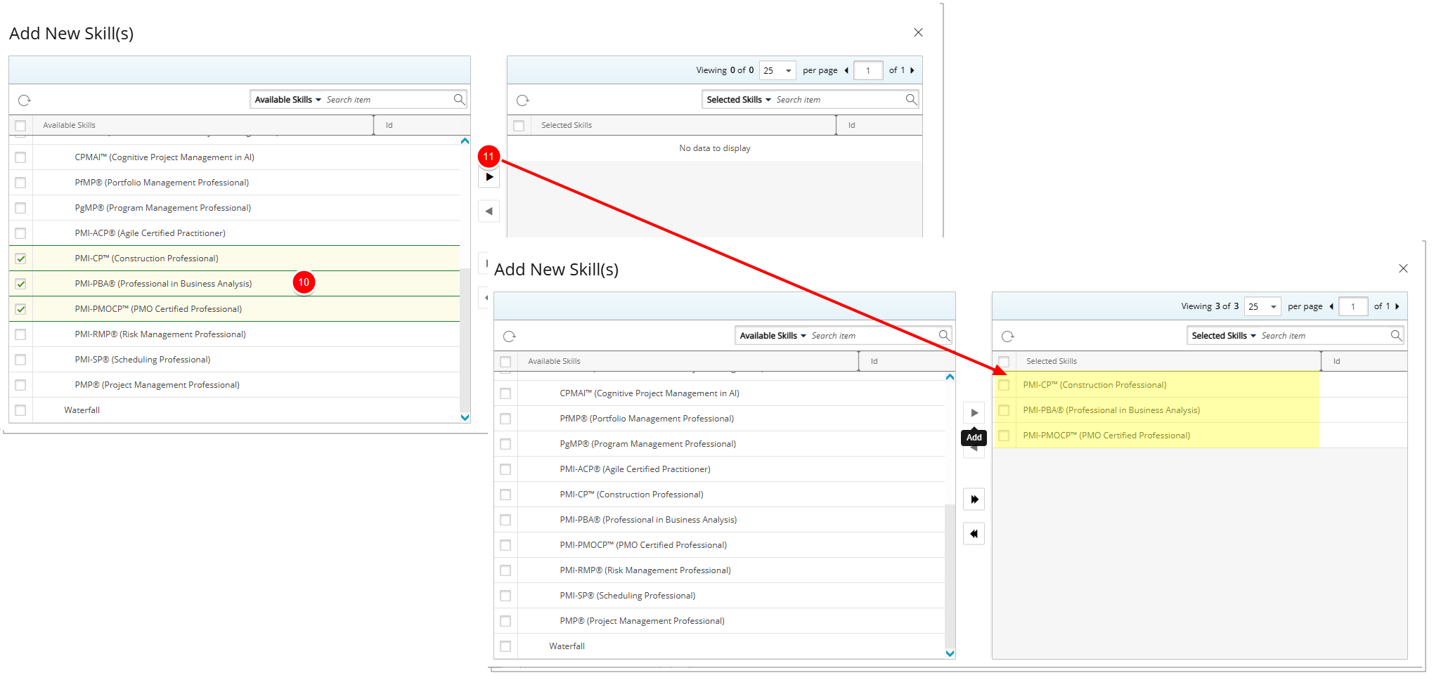 to move the selected Skills to the Selected Skills table on the right.