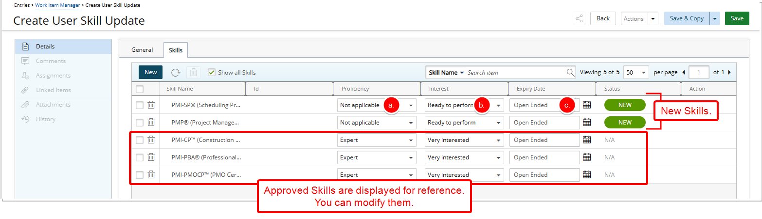 Note: Approved Skills are listed for reference. You can modify them. For more details see Modifying an Approved User Skill Update Work Item Entry.
