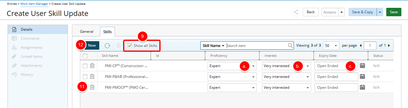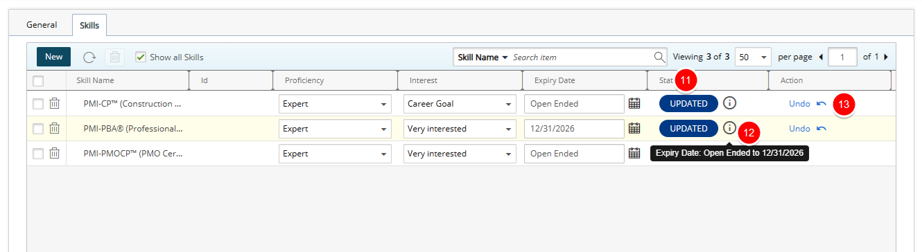 - For each skill you want to update, select the required Proficiency, Interest, or Expiry Date:
