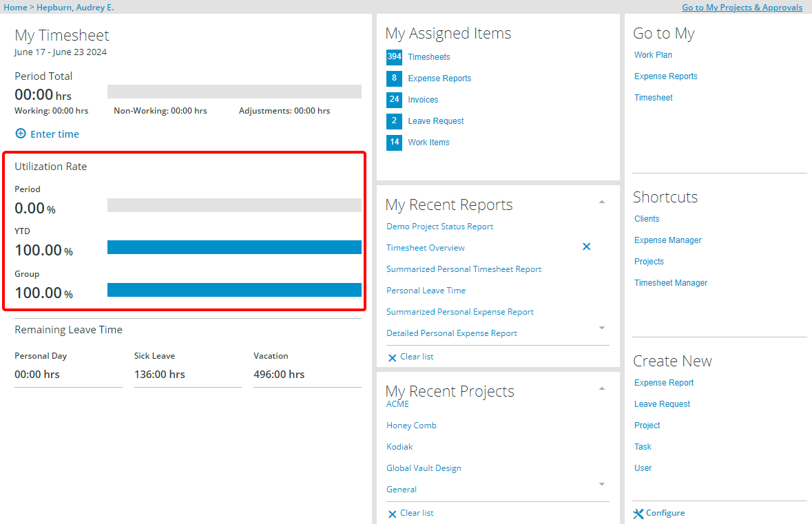 Navigate to the legacy Home page and note that the Utilization Rate is now visible on the legacy Home page:
