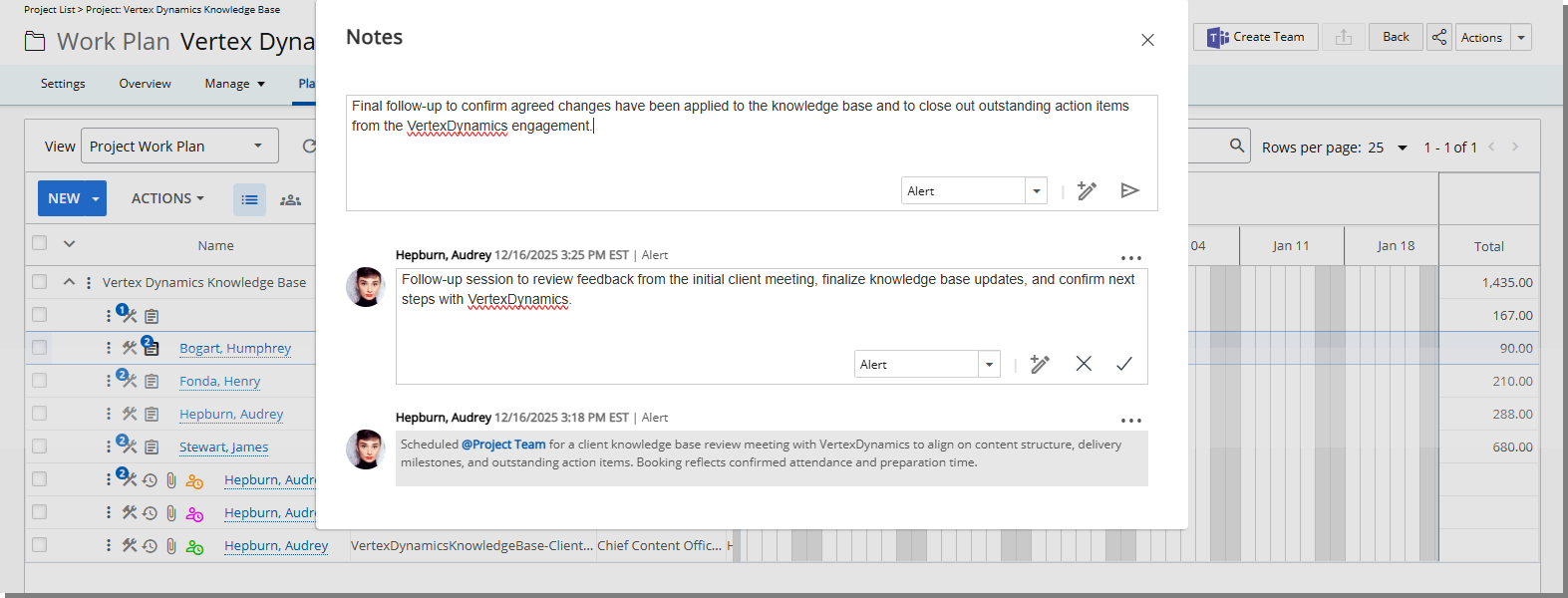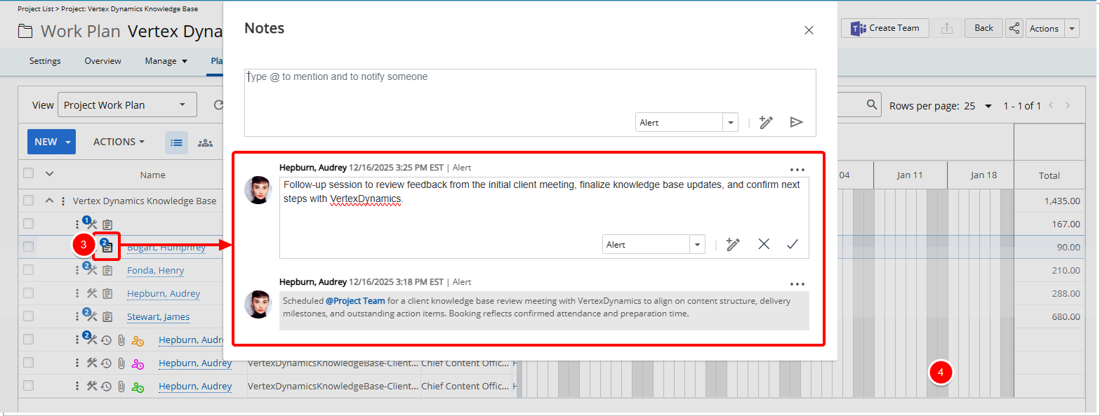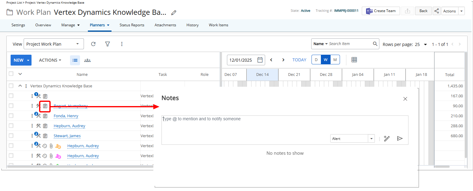 - When the Enable Mentioning in Comments & Notes setting located within the System Configuration page is turned on, you can mention others in the Work Plan Notes using @ notation. When adding a new Note, a placeholder message—“Type @ to mention and to notify someone”— appears next to the cursor, guiding you on how to tag others.