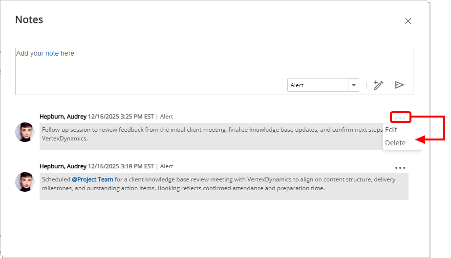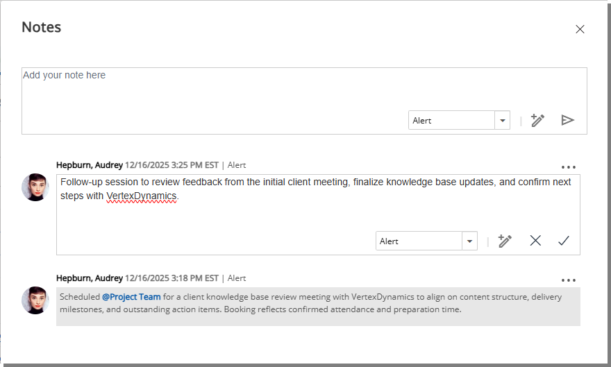 You can review existing notes to understand changes made over time or to reference earlier communications. If you have the required permissions, you can also edit or delete your own notes directly from this list.
