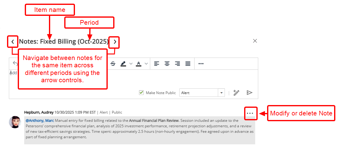 , ensuring they are aware of relevant updates or required actions. For details see Mention Users in Comments and Notes. - The dialog box will refresh and display your note below the text area.