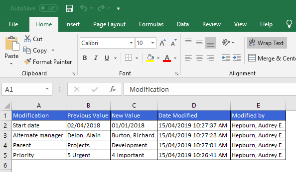 - View the exported Project History in Excel.
