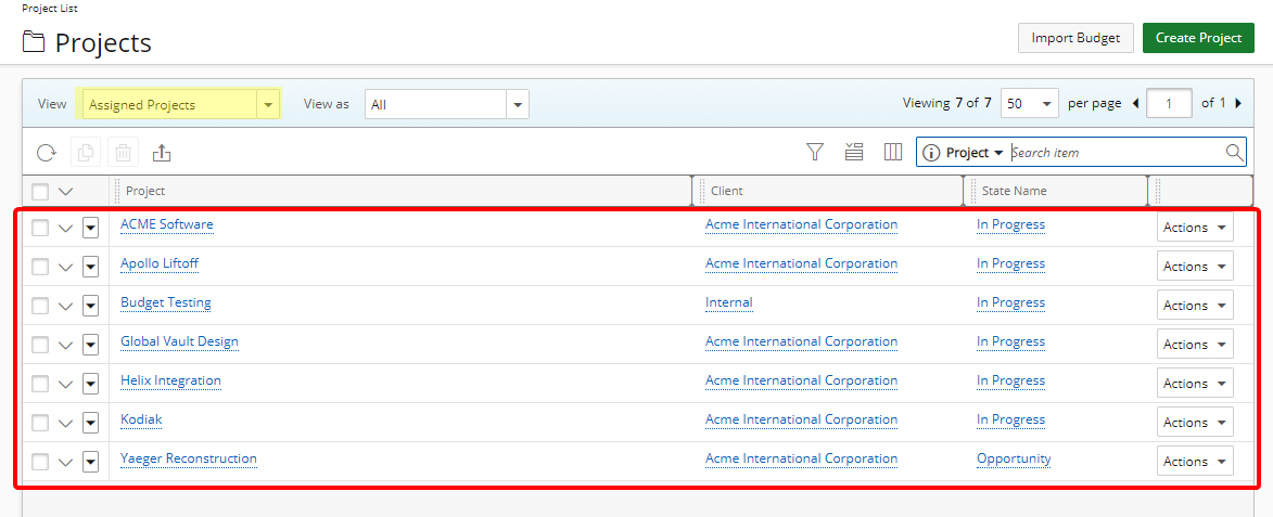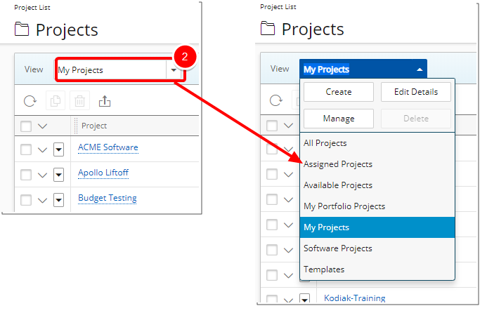 - Upon selecting a new View, the Project List page will refresh and list the Projects based on your newly selected View.
