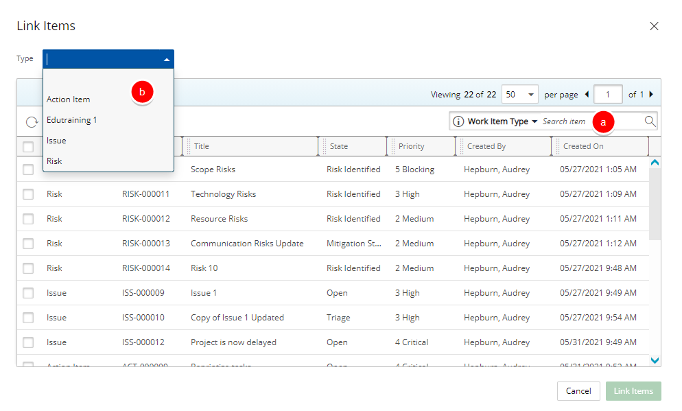 - From the Link Items dialog box, you can narrow down the list of Items by: