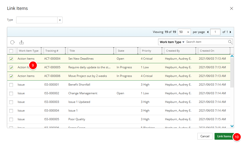 - Select the Work Item Entries you wish to link.