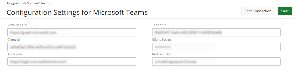 - Client Secret Entrez le Client Secret comme indiqué à l'étape 3 de Configuration de l'intégration avec Microsoft Teams | Création d'une application dans Azur.