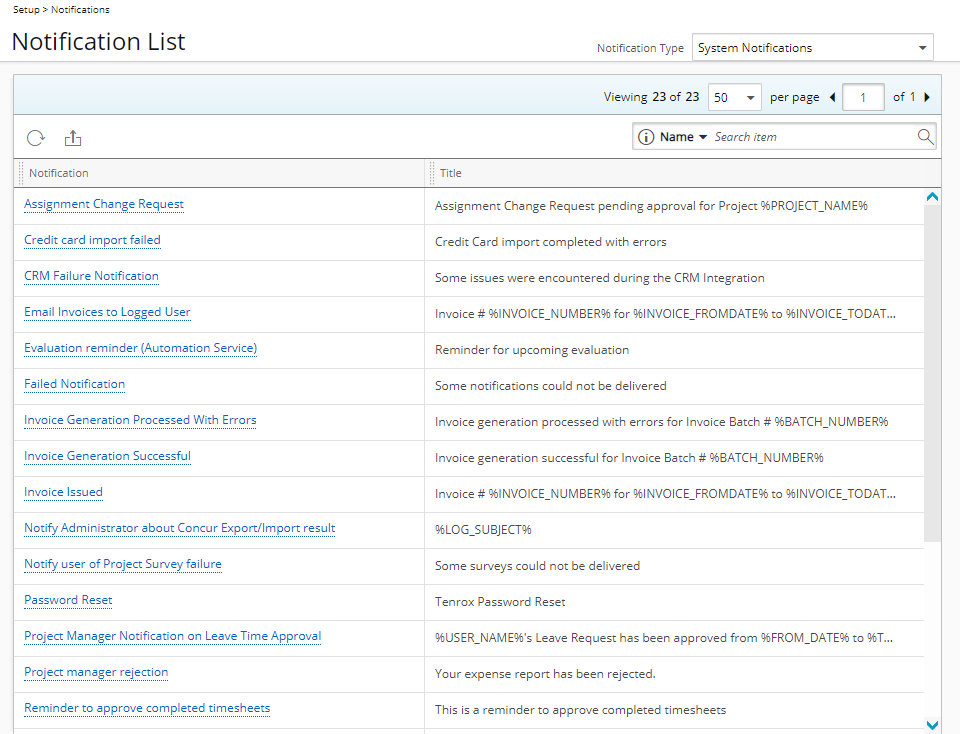Les notifications système sont accessibles depuis Configuration > Notifications , où vous pouvez personnaliser/modifier et/ou consulter, afin que le système envoie automatiquement des notifications à diverses destinations prédéfinies.