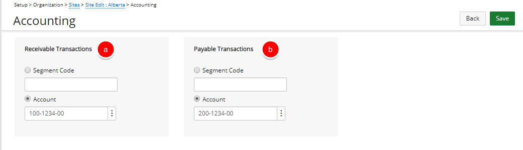 Chaque objet OBS et WBS dans Upland PSA utilisé pour une facture ou des lots à payer possède le bouton Comptabilité sur sa page d'édition. Une fois cliqué, le bouton Comptabilité affiche la page Modification de la comptabilité, vous permettant de remplacer la configuration de la segmentation globale.