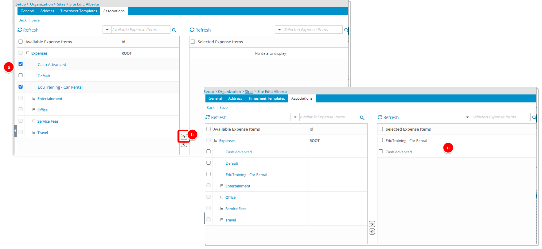 - Vous pouvez associer plusieurs Éléments de dépenses à un Site à partir du nouvel onglet Associations situé sur la page Modification du site (Configuration > Organisation > Sites).