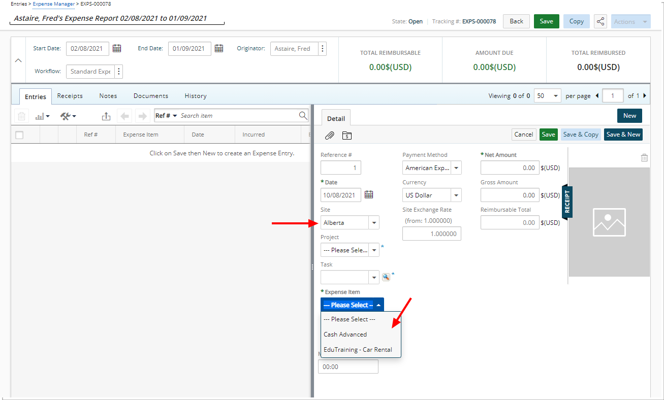 Lorsque l'association requise est créée, lors de la création d'une Rapport de dépense et du choix du site, seuls les éléments de dépenses associés seront disponibles pour l'utilisateur.