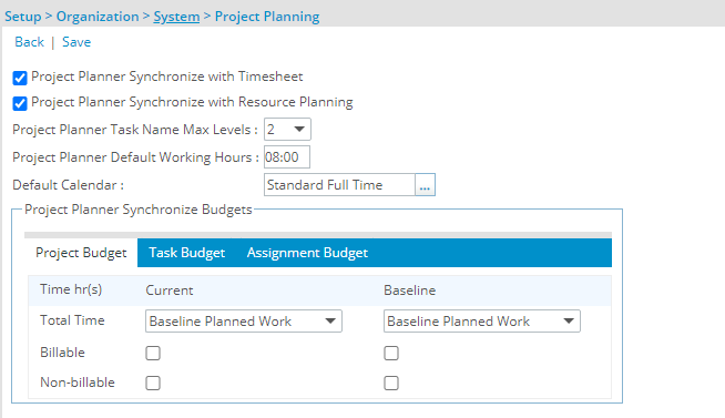 Vous pouvez également choisir les niveaux maximum du nom de la tâche du planificateur de projet ainsi que les heures de travail par défaut . Un calendrier par défaut pour Project Planner pour tous les projets peut également être défini ici.