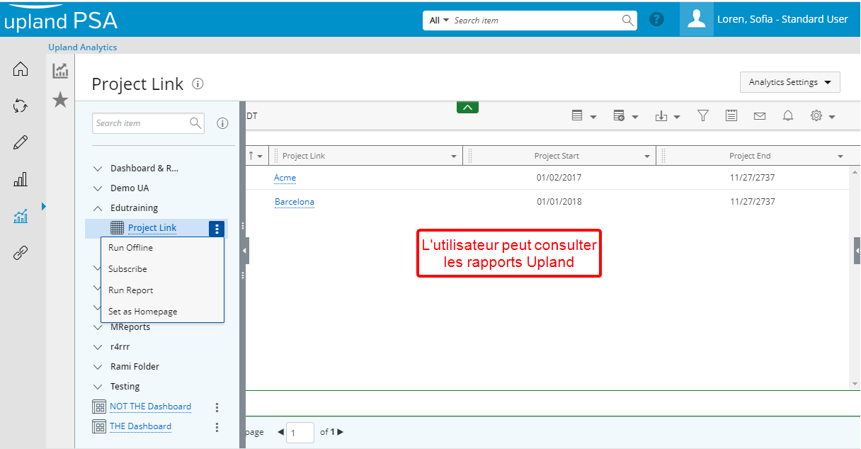 - Le profil de sécurité de l'utilisateur standard a désormais accès à Upland Analytics pour afficher les rapports et les abonnements aux tableaux de bord qui sont partagés avec lui. Cependant, ils ne peuvent pas créer de nouveaux rapports/tableaux de bord ni copier/modifier des rapports/tableaux de bord existants. Ils peuvent également créer, modifier et supprimer leurs propres fichiers et abonnements via le menu contextuel Paramètres Analytics .