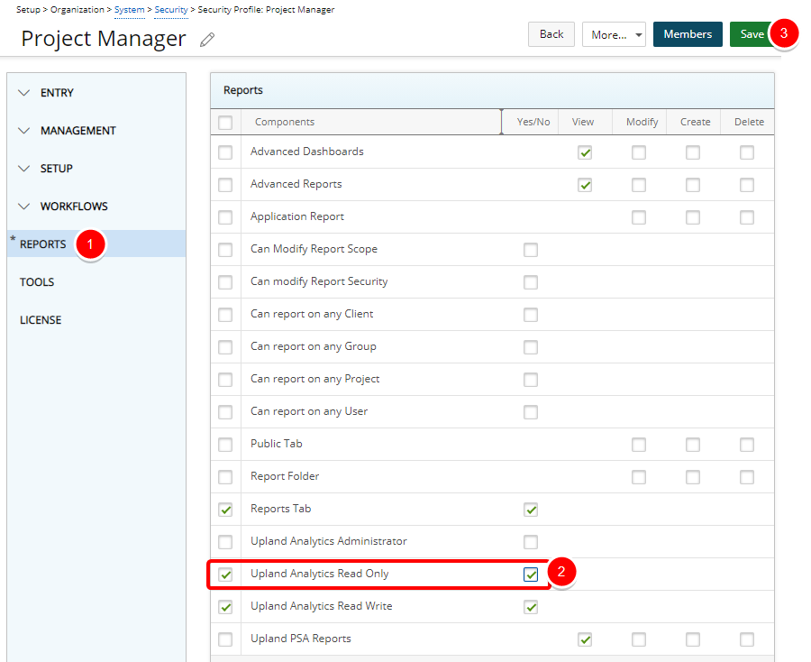 - Sélectionnez l'option Upland Analytics Read Only qui permet aux utilisateurs relevant de ce profil de sécurité de :