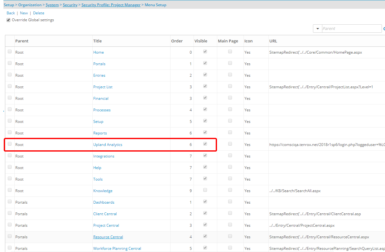 - Upland Analytics : lorsqu'il est activé, permet aux utilisateurs d'accéder au nouveau module Upland Analytics via la barre d'icônes.