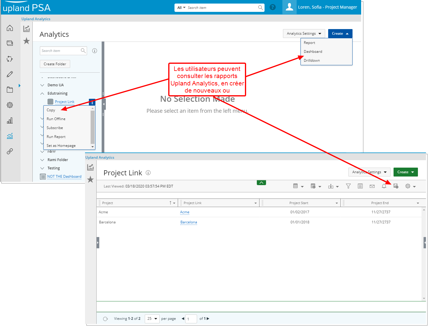 - Le profil de sécurité du chef de projet a désormais accès à Upland Analytics pour créer, modifier et supprimer ses propres rapports, tableaux de bord et abonnements.