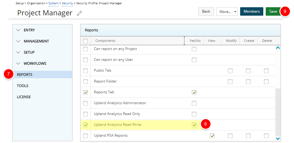 Example: Accorder, un Upland PSA L'administrateur a reçu pour instruction d'autoriser la création, la copie et la suppression de rapports Upland Analytics pour le profil de sécurité du chef de projet. Il peut s'assurer que cette fonctionnalité est disponible en sélectionnant l'option Oui pour « Upland Analytics Read Write » sous l'onglet Rapports du profil de sécurité du chef de projet.