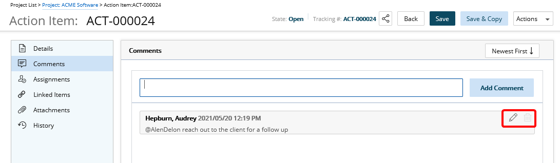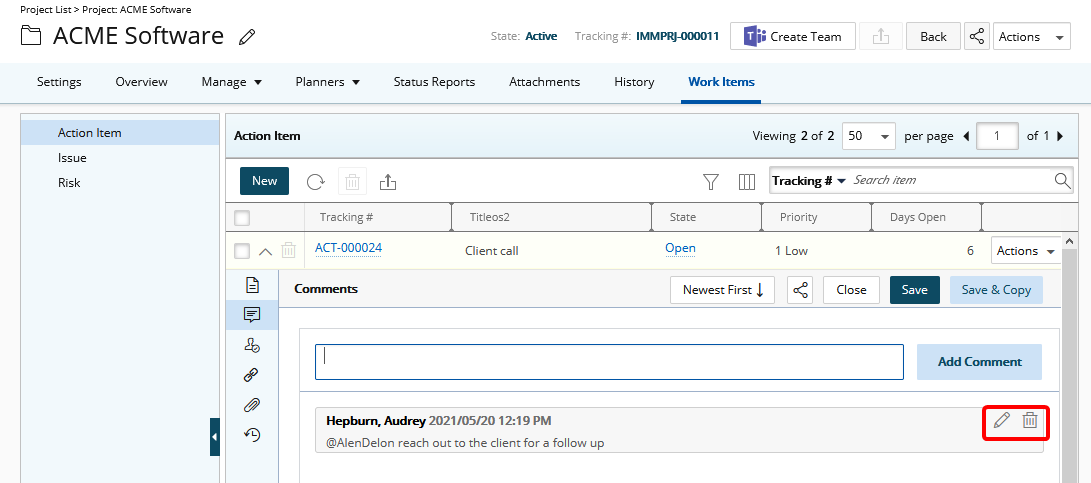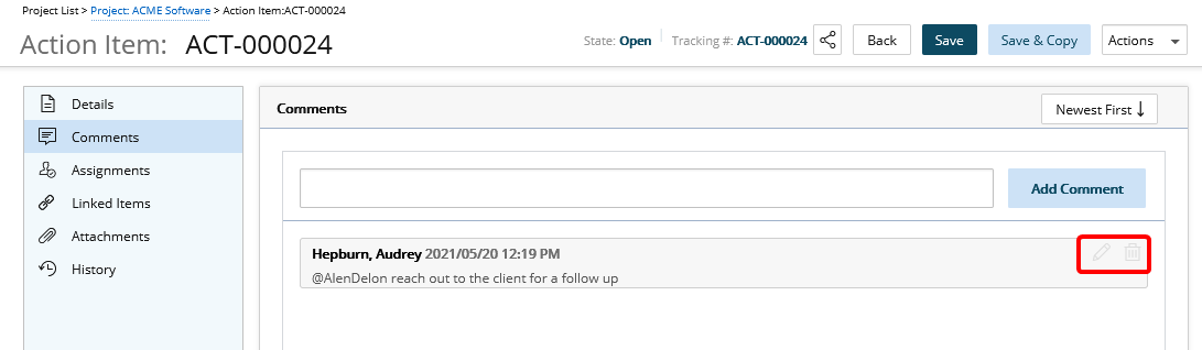 - Pour les utilisateurs disposant uniquement du droit Peut supprimer les commentaires d'autres utilisateurs sur les entrées d'éléments de travail , notez que le bouton Supprimer est disponible :