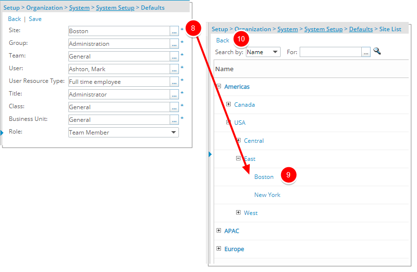 - Lors du chargement de la page Paramètres par défaut, les options suivantes sont disponibles : Site , Groupe , Équipe , Utilisateur , Type de ressource utilisateur , Titre , Classe , Unité commerciale et Rôle .