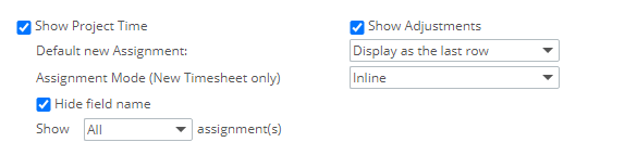 - Les options Nouvelle affectation par défaut et Afficher les affectations <x> s'appliquent aux sections Afficher l'heure du projet et Afficher les ajustements de la feuille de temps. Elles sont activées lorsque l'option Afficher l'heure du projet ou Afficher les ajustements est sélectionnée. Choisissez l'une des options disponibles pour la zone de sélection Nouvelle affectation par défaut :