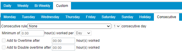 - Les onglets Quotidien , Hebdomadaire , Bihebdomadaire et Personnalisé décrivent, pour différents types de périodes, comment et quand les heures doivent être ajoutées aux heures supplémentaires ou aux heures supplémentaires doubles . Pour plus de détails, reportez-vous à :