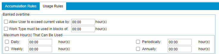 - Sélectionnez l'onglet Règles d'utilisation pour définir la manière dont les heures supplémentaires gagnées doivent être utilisées comme heures supplémentaires mises en banque. Ces règles régissent la manière dont les heures supplémentaires gagnées doivent être utilisées comme heures supplémentaires mises en banque, c'est-à-dire comme heures supplémentaires non payées, mais plutôt échangées ultérieurement contre du temps libre. Pour plus de détails, reportez-vous à Traitement des heures supplémentaires : onglet Règles d'utilisation .