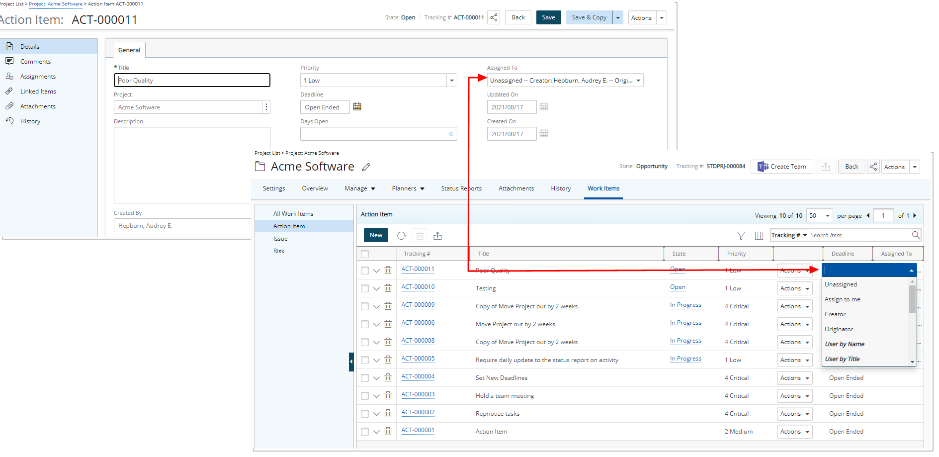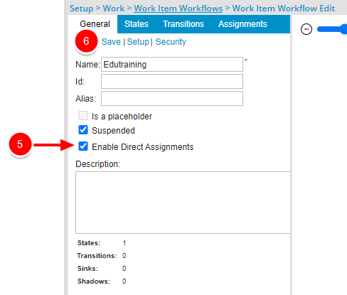 Par défaut, lors de la création d'une entrée d'élément de travail, l'affectation directe est définie sur Non attribuée et le ou les États sont attribués par défaut en fonction des affectations de flux de travail.
