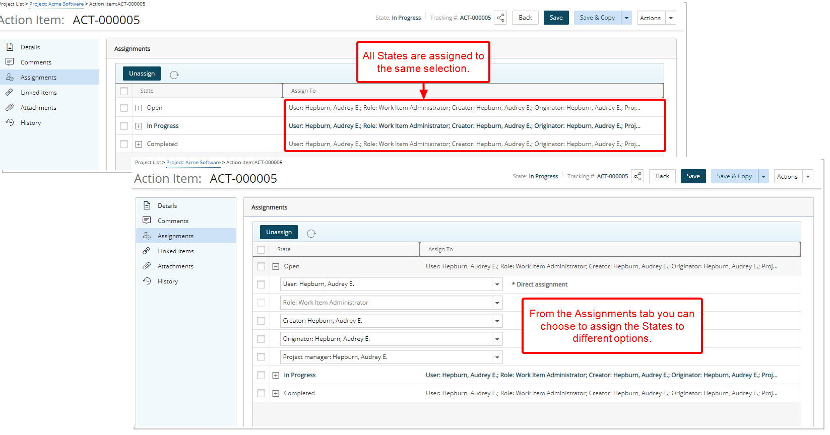 Lorsqu'une affectation directe est choisie, tous les États sont affectés à cette sélection. L'affectation directe peut être modifiée à partir de l'onglet Affectations de la page Modification de l'élément de travail, où vous pouvez choisir d'attribuer les États à différentes options.
