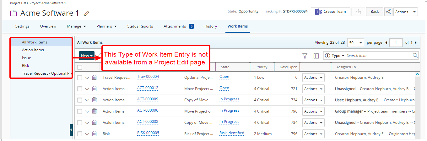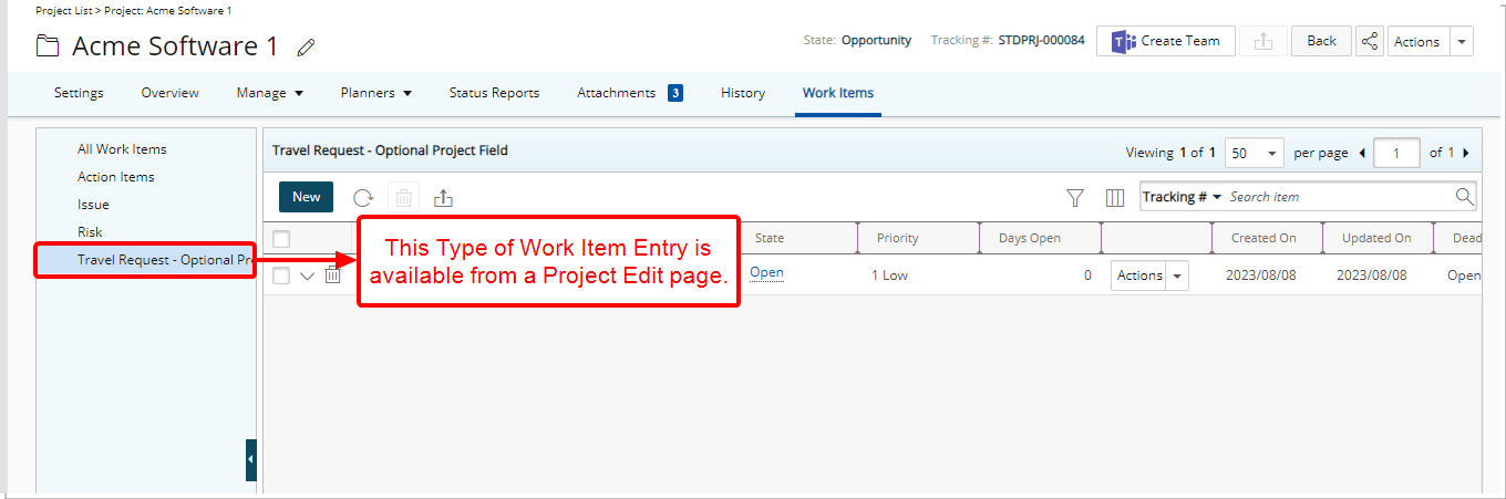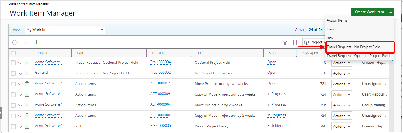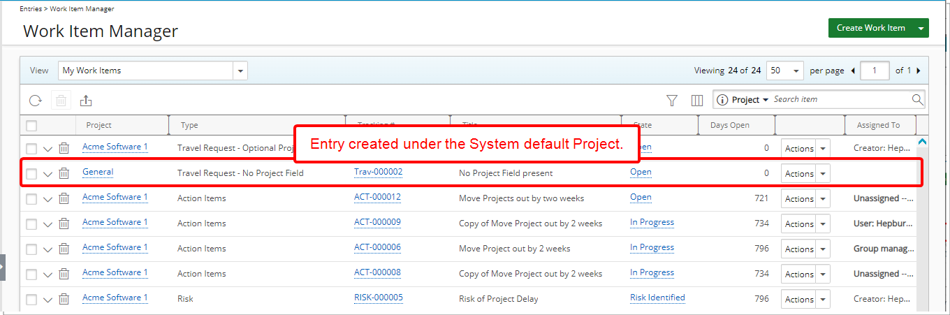 - Les entrées d'élément de travail créées avec ce type d'élément de travail seront répertoriées sous le projet par défaut du système.