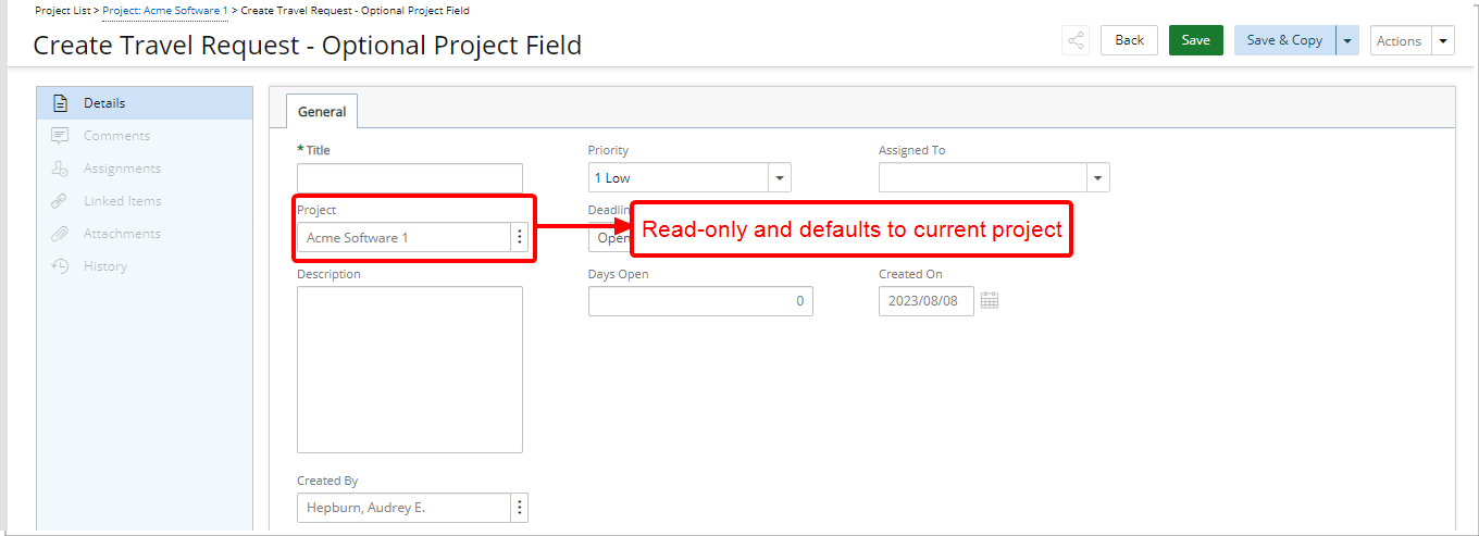 - Le champ Projet est en lecture seule et correspond par défaut au projet à partir duquel vous créez l'entrée d'élément de travail.