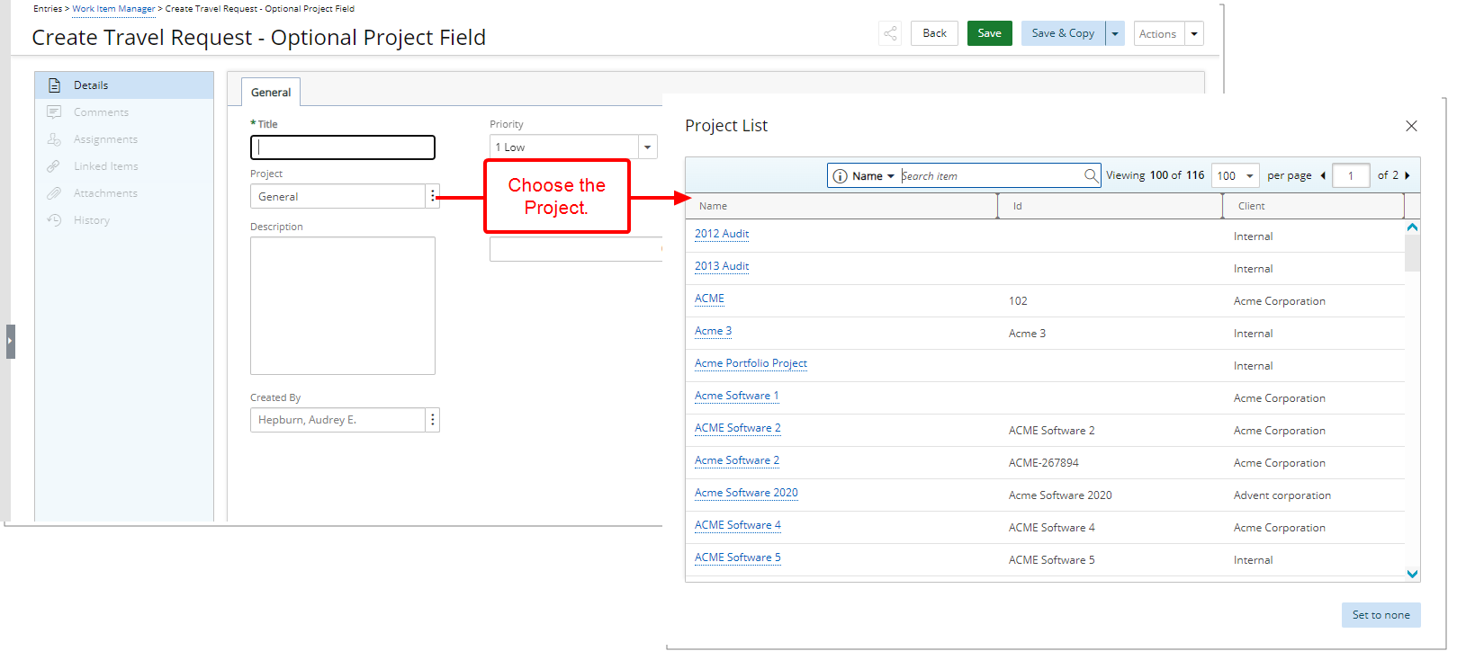 - Si vous créez ce type d'entrée d'élément de travail à partir de la page Gestionnaire d'éléments de travail, vous pouvez parcourir et choisir le projet requis.