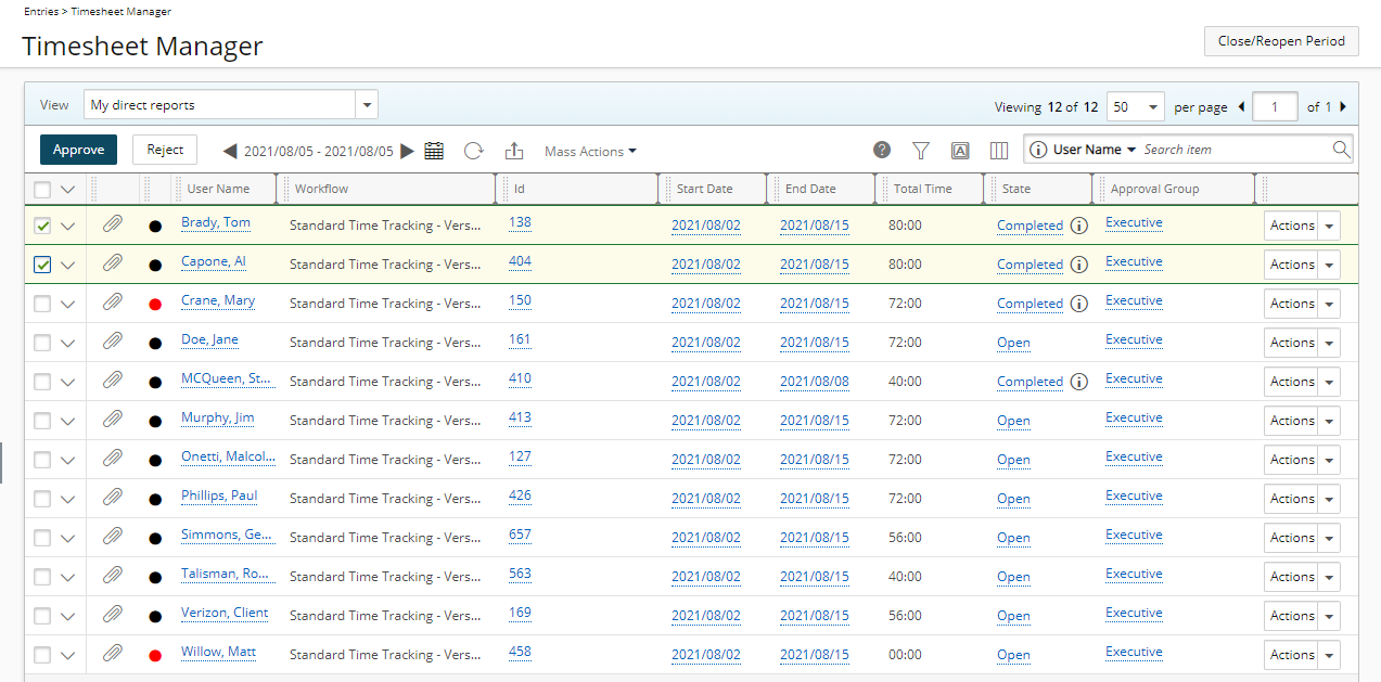 La gestion des feuilles de temps concerne la gestion des feuilles de temps par les chefs de groupe et de projet dans Timesheet Manager. À partir de Timesheet Manager, les responsables peuvent afficher, approuver ou rejeter les feuilles de temps des utilisateurs, ainsi qu'accéder aux feuilles de temps des utilisateurs pour ajouter, modifier et supprimer des affectations.