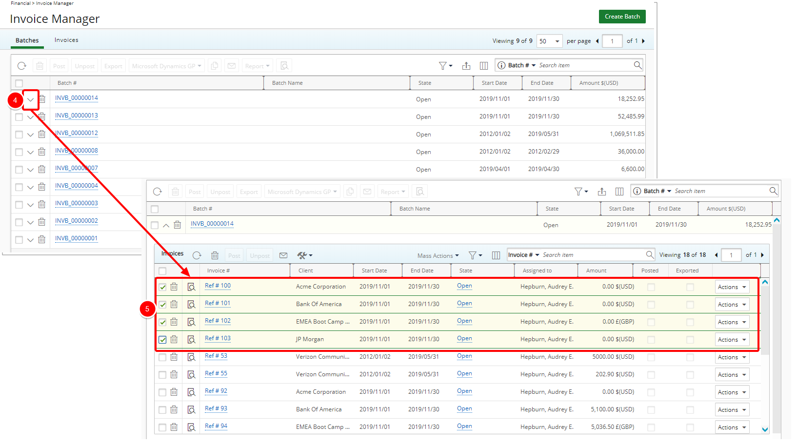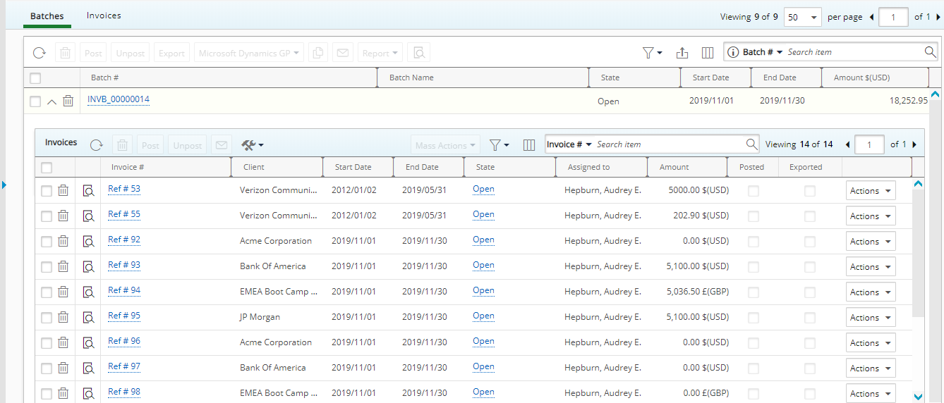 - Sur la page Gestionnaire de factures qui s'affiche, vous verrez l'onglet Lots avec une liste de tous les lots de factures qui sont ouverts, terminés ou fermés en fonction des critères de filtre sélectionnés.