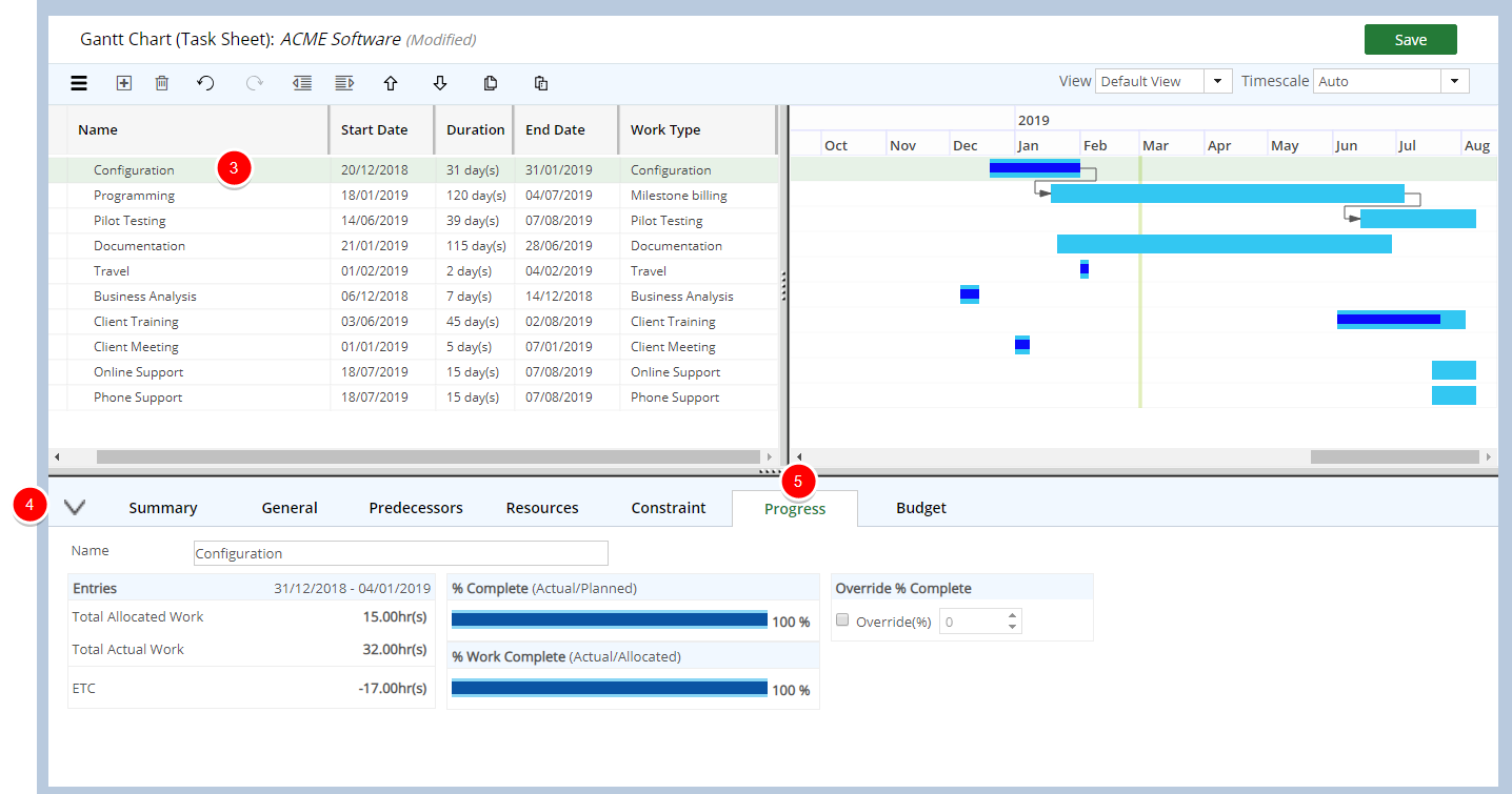Ceci n'est actuellement ni fonctionnel, ni calculé, mais étant donné que vous pouvez actuellement accéder à l'onglet Progression, vous devez savoir à quoi vous attendre dans la version actuelle. La version finale et officielle qui sera disponible uniquement à la sortie de Upland PSA 2016 R1 affichera la progression de la tâche sous forme de valeur en lecture seule, le calcul étant Travail réel / Travail prévu. Travail réel = saisie du temps effectuée pour la tâche dans TS ; Travail planifié = valeur sous l'onglet Ressources du détail de la tâche dans le planificateur de projet.