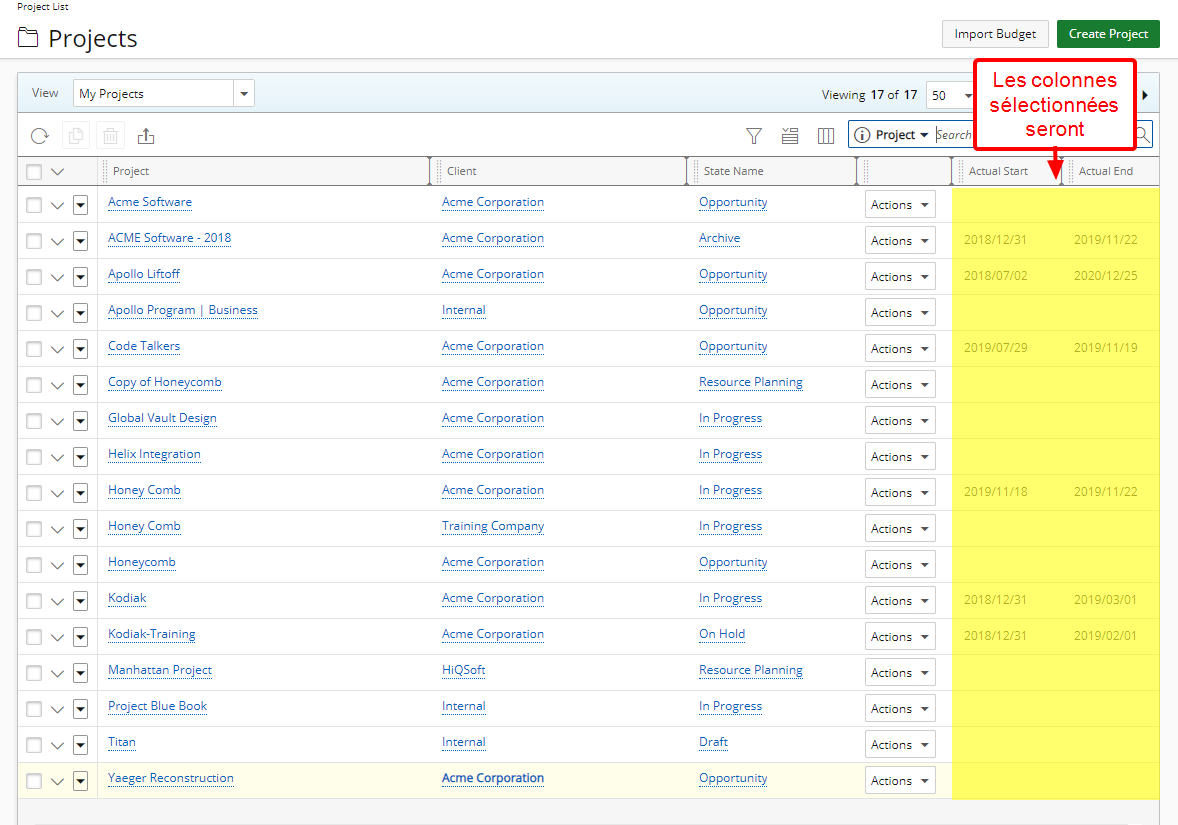 .Remarque: Pour une liste de toutes les options de sélection de colonnes disponibles, reportez-vous à l'article Options de sélection de colonnes de la liste de projets.