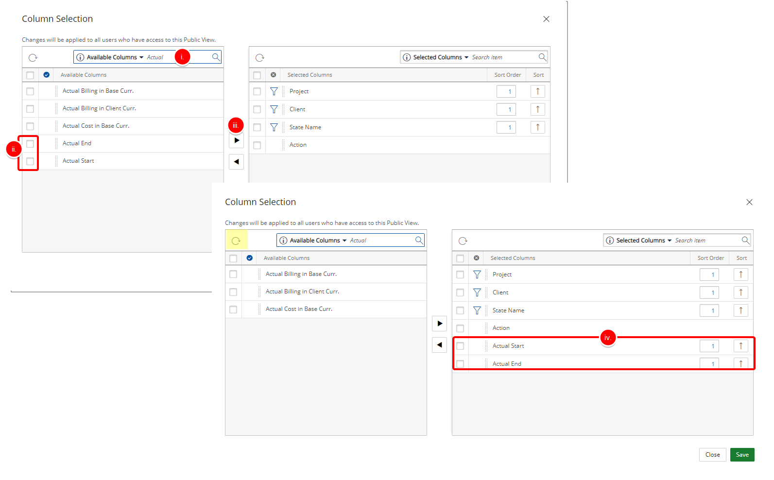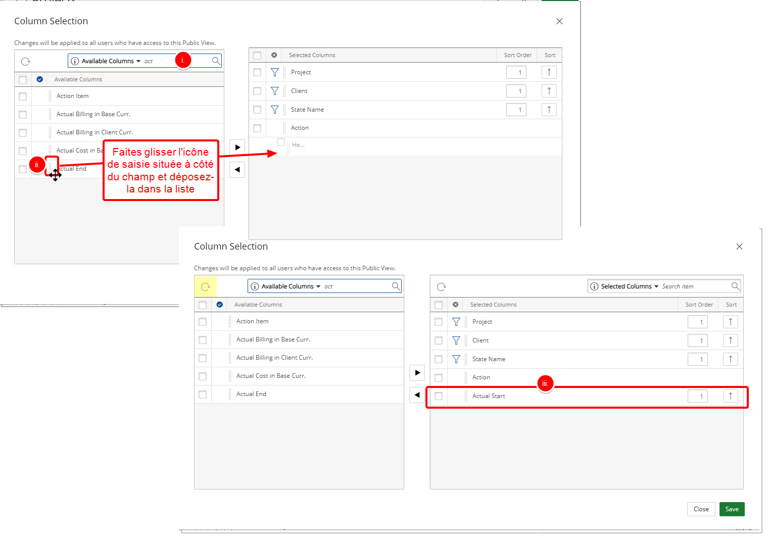 Conseil : Vous pouvez facilement faire glisser et déposer les colonnes sélectionnées vers le haut ou vers le bas pour ajuster leurs positions dans la liste des projets.