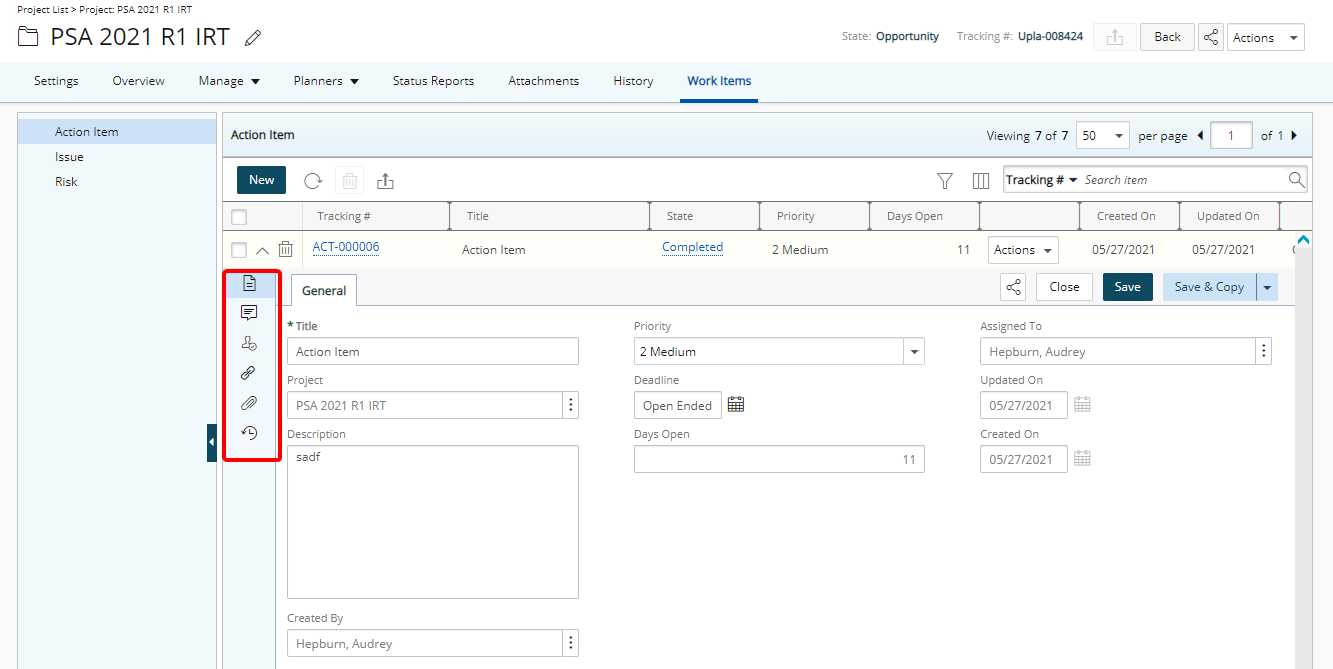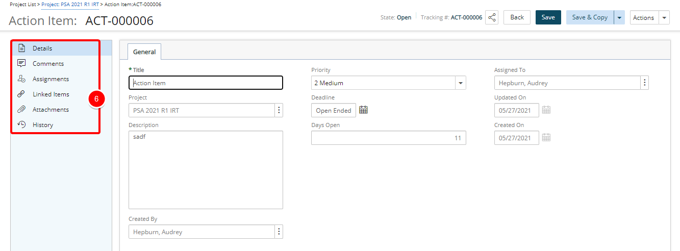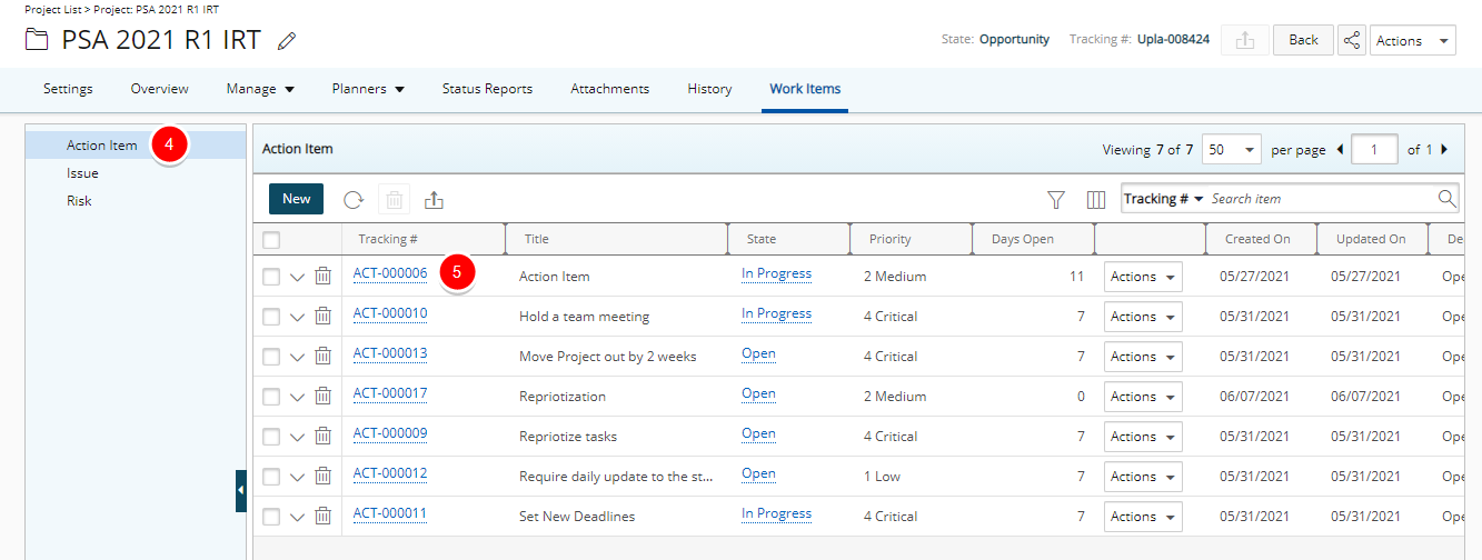 - Dans la liste des entrées d'élément d'action, cliquez sur le numéro de suivi de l'entrée d'élément d'action que vous souhaitez modifier.