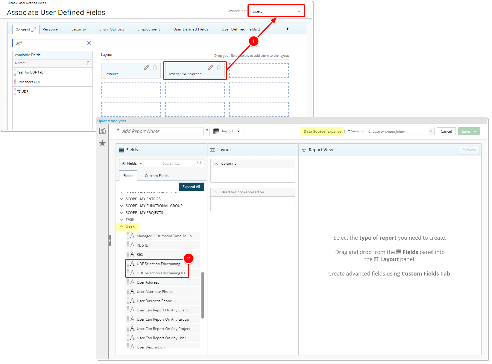 - En accédant à Upland Analytics, vous pouvez sélectionner et utiliser le champ de sélection UDF de test en choisissant une source de données qui contient la vue utilisateur.