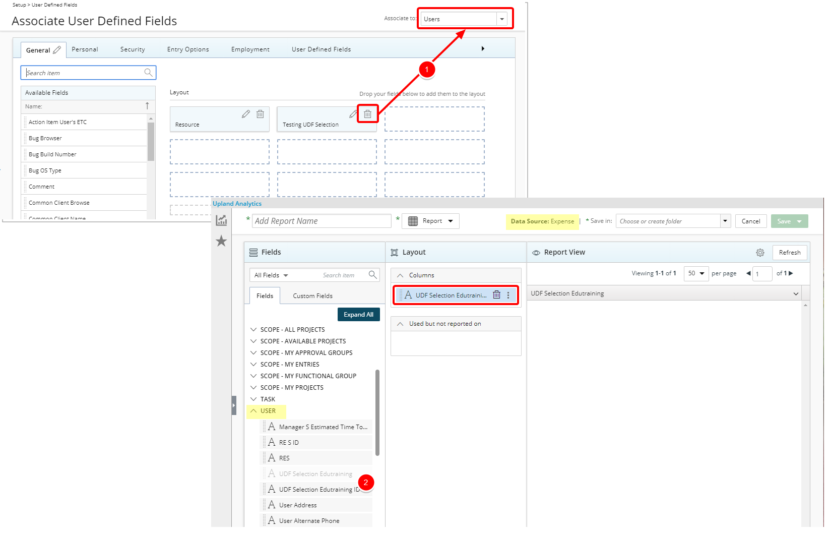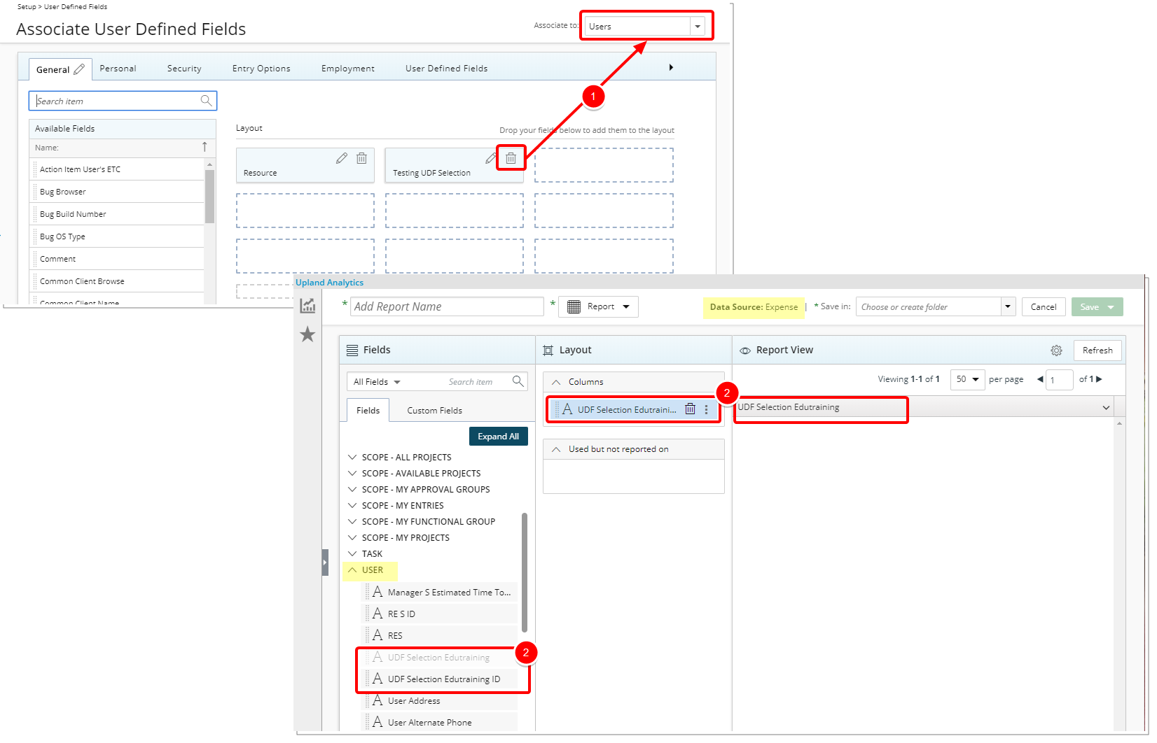 - Lorsque vous accédez à Upland Analytics, vous ne pouvez plus sélectionner et utiliser le champ de sélection UDF de test en choisissant une source de données contenant la vue utilisateur.