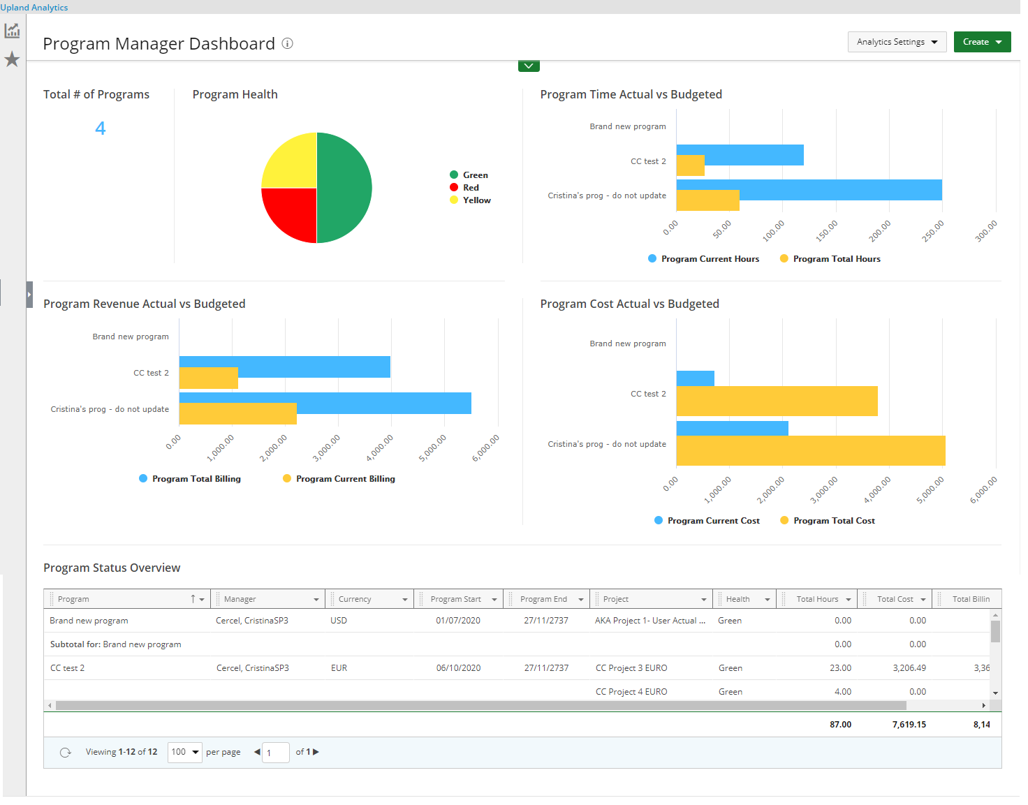 - Aperçu de l'état du programme : gestionnaire, devise, dates de début et de fin réelles, nom(s) du projet, santé du projet, durée totale réelle, coût réel en devise du programme, facturable réel en devise du programme et symbole monétaire du ou des programmes associés au programme. l'utilisateur connecté.